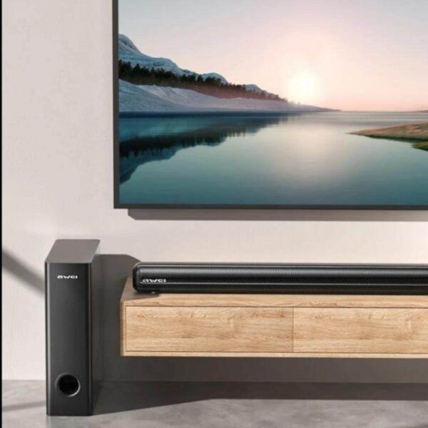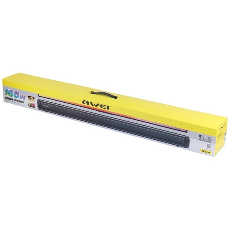 ساندبار Awei KT22 دارای طراحی مدرن و مینیمال با بدنه مقاوم و رنگ مشکی مات است.ابعاد استاندارد آن باعث میشود به راحتی زیر تلویزیون قرار گیرد.سابووفر جداگانه نیز بیس عمیق و قدرتمندی ایجاد میکند که فضای اتاق را کاملاً پوشش میدهد.